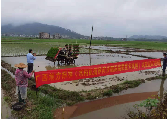 广西地方标准《水稻机插秧同步侧深施肥技术规程》试验验证现场也在平南县开展,旨在加快水稻机插秧同步侧深施肥技术的试验研究和示范推广,促水稻农机农艺融合,推动我区水稻生产机械化进程。验证现场上,农机技术人员通过与厂家技术人员、机手交流探讨和上机实操,进一步了解水稻机插秧同步侧深施肥技术原理,基本掌握插秧机和侧深施肥机的操作要领和调节、维护、保养注意事项,验证不同插秧行距、株距与肥料的选择、施肥量等因素对水稻生长情况及产量的影响,为探索技术规程提供科学指导。