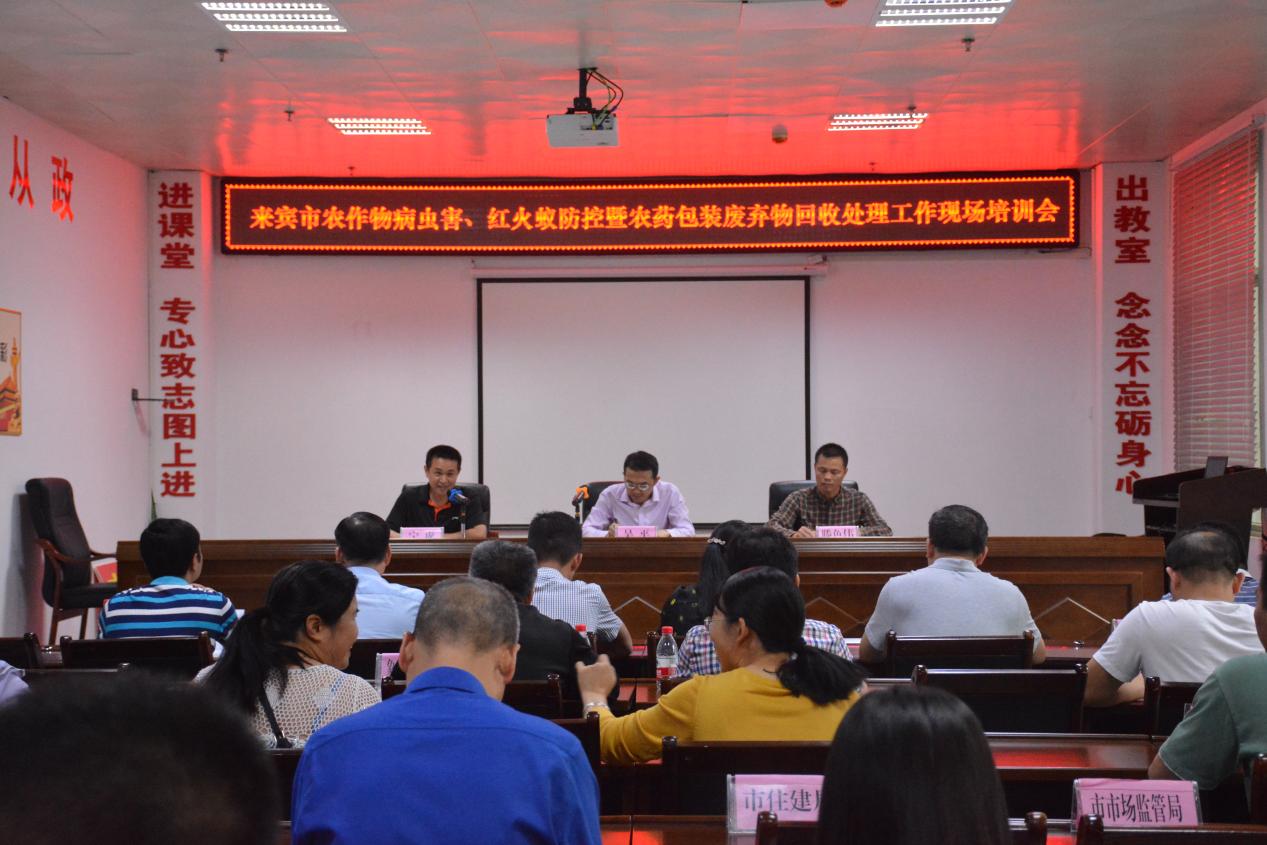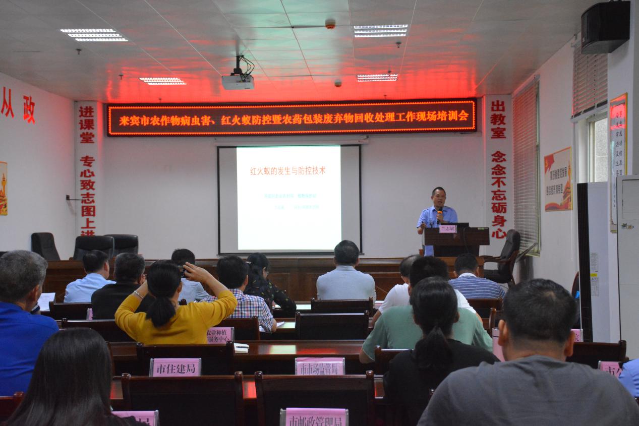 2021年5月20日,来宾市召开全市农作物病虫害、红火蚁防控暨农药包装废弃物回收处理现场培训会,会议传达了全区农药管理工作会议精神,通报了全市重大病虫害发生情况,研究部署了当前和今后的重点工作。市农业农村局总农艺师吴平、各县(市、区)农业农村局分管领导及相关科(股)室、局属有关单位负责人,市红火蚁疫情应急防控指挥部各成员单位业务骨干参加会议。