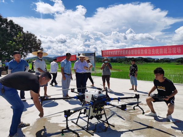 8月18日上午,钦州市植物保护站在钦北区大寺镇召开2021年钦州市南方水稻黑条矮缩病防病治虫统防统治现场会,对今年晚造南方水稻黑条矮缩病防控工作进行再动员、再部署、再落实,并进行了水稻植保无人机飞防演示。市农业农村局二级调研员韦大器、市种植业科负责人钟晓媛,钦北区农业农村局副局长王朝胜,钦北区农业农村局相关科室人员和全市植保系统人员、钦北区乡镇农业站站长以及部分种植大户共68人参加了培训。