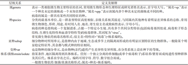 微生物细菌、真菌等的命名采用生物学的双名法,即由拉丁文的属名和种名组成,斜体书写或下加横线,属名的首字母大写。在有物种分化的情况下,采用三名法,即在双名基础上,再加上亚种(subsp.)、变种(var.)及血清型(serotypes)等的命名(见表1)。可附带命名人名字及命名时间,定名人用正体,首字母大写,但初定名人需加括号放在后定名人之前,最后是定名时间。如Bacillus subtilis(Ehrrnbeg)Cohn 1982,Bacillus thuringiensis subsp. israelensis strain SA-11等。