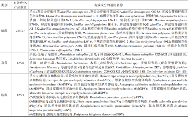 微生物农药是以真菌、细菌、病毒或基因修饰的微生物等活体作为有效成分的农药。我国的微生物农药一直稳步发展,截至2020年12月31日,已取得登记的微生物农药有效成分有47种、产品548个,其数量分别占生物农药有效成分和产品数量的37.6%和31.6%。