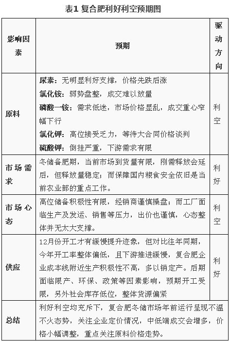 十月份以来复合肥主要原料价格走势多在震荡,尤其是氮肥以及一铵的疲弱行情造成了复合肥成本缺乏支撑,一是企业定价谨慎,迟迟不敢放价,二是经销商对后市价格多不看好,缺乏信心支撑。目前看尿素市场继续上涨动力不足,区间整理中;磷酸一铵新单交易气氛偏淡,实单重心下探;钾肥市场暂稳,流通货源量较之前期有所增加,价格显乱。原料整体行情难以释放利好信号,预计继续利空复合肥。
