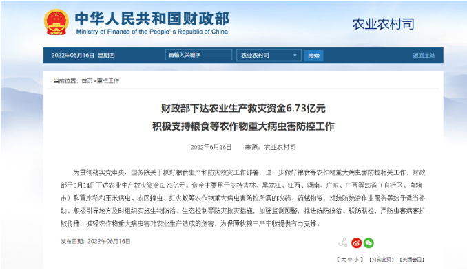 为贯彻落实党中央、国务院关于抓好粮食生产和防灾救灾工作部署,进一步做好粮食等农作物重大病虫害防控相关工作,财政部于6月14日下达农业生产救灾资金6.73亿元......