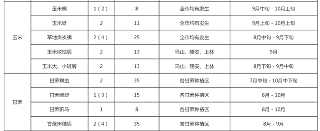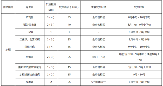 根据南宁市上半年农作物病虫害发生情况,参考南宁市中长期气象预测及综合当前农业生产进度、品种布局等因素进行分析,预计我市今年下半年农作物病虫害总体发生趋势为中等程度,主要病虫害有稻飞虱、稻纵卷叶螟、稻纹枯病、稻瘟病、水稻跗线螨、草地贪夜蛾、玉米螟、甘蔗螟虫、农田鼠害等。