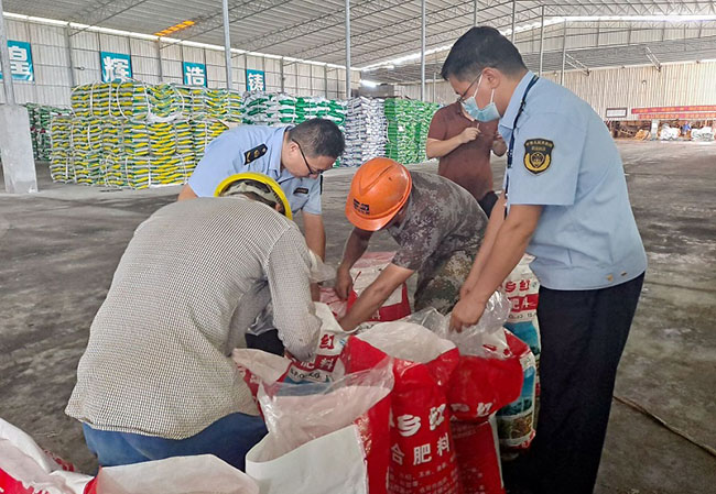 为确保农业生产“双抢”季节农资产品质量安全,近日,南宁市农业综合行政执法支队结合《自治区农业农村厅办公室关于做好2022年全区肥料市场专项整治监督抽查工作的通知》(桂农厅办发〔2022〕36号)文件要求,组织执法人员到横州市、青秀区等县(市、区)肥料生产经营企业(门店)开展肥料专项执法检查,重点查处无营业执照、无生产许可证、无肥料登记证、以不合格产品冒充合格产品、掺杂掺假、虚假标注等生产销售伪劣肥料产品的违法行为。