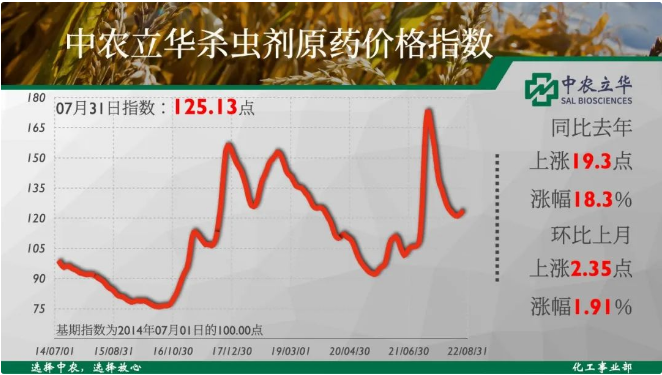 2022年07月31日中农立华杀虫剂原药价格指数报125.13点,环比上月上涨1.9%,主要是烟碱类产品、毒死蜱原药的回调。