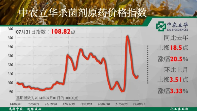 2022年07月31日中农立华杀菌剂原药价格指数报108.82点,环比上月大幅上涨3.3%,杀菌剂品种低位反弹。