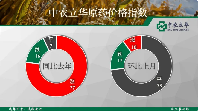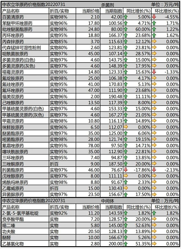2022年07月31日,中农立华原药价格指数报159.72点,环比上月基本持平;跟踪的上百个产品中,同比去年,虽然仍有77%的品种上涨,环比上月,17%的产品冲高回落,下跌品种逐步减少,而10%的产品上涨,市场稳定为主,涨跌幅超过5%的,仅嘧菌酯原药(7.7%)、毒死蜱原药(6.1%)。