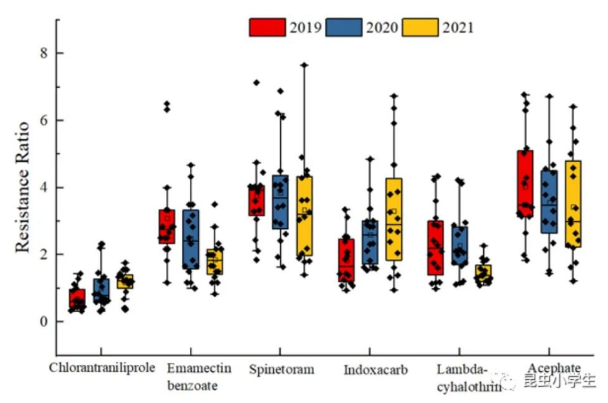 图3 2019-2021年草地贪夜蛾田间种群的抗药性水平