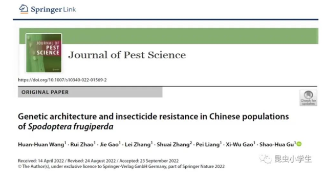 近日,中国农业大学植物保护学院高希武教授团队在昆虫学TOP期刊Journal of Pest Science(IF5 Year=5.562/Q1)上在线发表了题为"Genetic architecture and insecticide resistance in Chinese populations of Spodoptera frugiperda"的研究论文....
