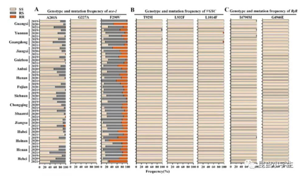 图4 草地贪夜蛾杀虫剂靶基因的基因型及突变频率