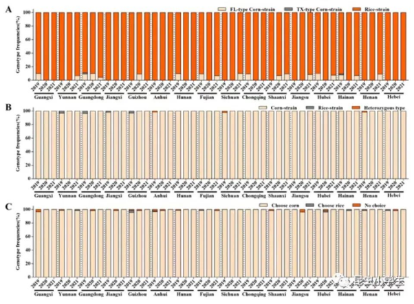 草地贪夜蛾有水稻型和玉米型,它们对化学杀虫剂具有不同的敏感性。该研究首先通过大样本利用Tpi和COl基因分型同时结合幼虫取食偏好性测定了入侵我国草地贪夜蛾的遗传结构,结果表明入侵我国的草地贪夜蛾主要是玉米型。