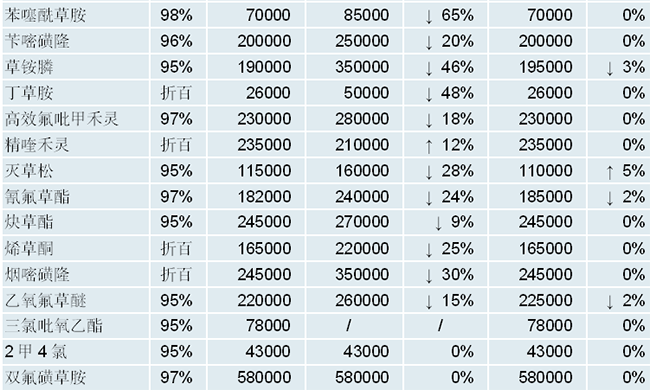 氯氟吡氧乙酸原药价格不变,目前市场报价17.5万元/吨;唑草酮原药价格保持稳定,目前市场报价95万元/吨;二氯吡啶酸原药价格稳定,目前市场报价36万元/吨;氨氯吡啶酸原药价格稳定,目前市场报价30万元/吨;氯嘧磺隆原药价格稳定,目前市场报价19.5万元/吨;炔苯酰草胺原药价格稳定,目前市场报价20万元/吨;五氟磺草胺原药价格有所下调,目前市场报价140万元/吨;甲基碘磺隆钠盐原药价格稳定,目前市场报价150万元/吨;草甘膦出口减量,下游信心不足,厂家协商定价,价格有所上调,目前市场报价在5.2万元/吨;2,4-D原药行情平稳,目前市场报价2.4万元/吨;唑嘧磺草胺原药价格稳定,市场报价58万元/吨;甲氧咪草烟原药价格稳定,市场报价80万元/吨;吡唑草胺原药价格稳定,目前市场报价14.5万元/吨;精异丙甲草胺原药价格稳定,目前市场报价6.3万元/吨;甲磺草胺原药价格稳定,目前市场报价28万元/吨;丙炔氟草胺原药价格稳定,目前市场报价45万元/吨;丁噻隆原药价格稳定,市场报价13万元/吨;丙草胺原药价格有所下调,目前市场报价3.7万元/吨;苯噻酰草胺厂家停车检修,原药价格稳定,目前市场报价7万元/吨;苄嘧磺隆原药价格稳定,目前市场报价20万元/吨;草铵膦原药价格轻微下调,产能逐步释放,目前市场报价19万元/吨;丁草胺原药价格稳定,目前市场报价2.6万元/吨;高效氟吡甲禾灵原药原材料高位,出口排单为主,价格稳定,目前市场报价23万元/吨;精喹禾灵原药市场无库存,原材料高位,出口订单为主,价格稳定,目前市场报价23.5万元/吨;灭草松原药厂家环保压力较大,原药出口为主,价格轻微上调,目前市场报价11.5万元/吨;氰氟草酯原药上游原材料高位,价格轻微下调,目前市场报价18.2万元/吨;炔草酯原药价格稳定,目前市场报价24.5万元/吨;烯草酮原药价格稳定,目前市场报价16.5万元/吨;烟嘧磺隆原药价格稳定,目前市场报价24.5万元/吨;乙氧氟草醚原药厂家交前期出口订单为主,价格轻微下调,目前市场报价22万元/吨;三氯吡氧乙酯原药价格稳定,目前市场报价7.8万元/吨;2甲4氯原药价格稳定,目前市场报价4.3万元/吨;双氟磺草胺原药价格稳定,目前市场报价58万元/吨。