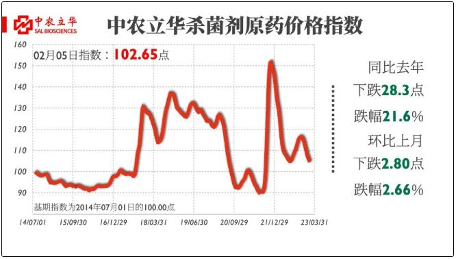 2023年2月5日,中农立华杀菌剂原药价格指数报102.65点,同比去年大跌21.6%,环比上月下跌2.66%。