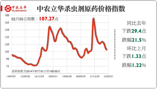 2023年2月5日,中农立华杀虫剂原药价格指数报107.27点,同比去年大幅下跌21.5%,环比上月下跌1.22%。