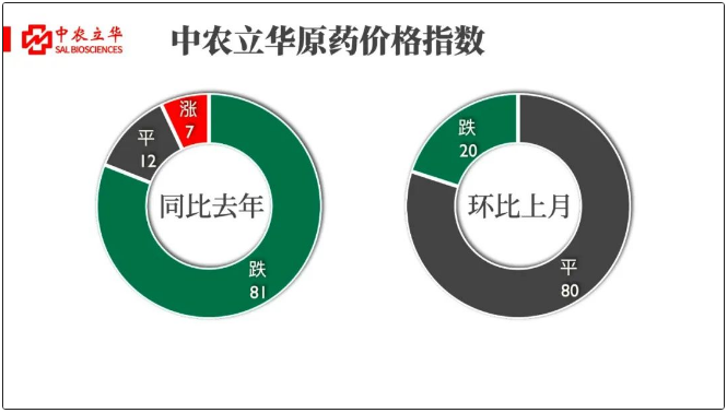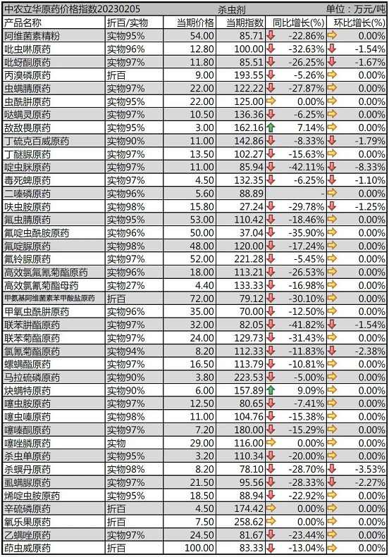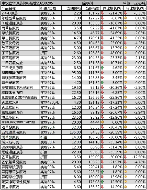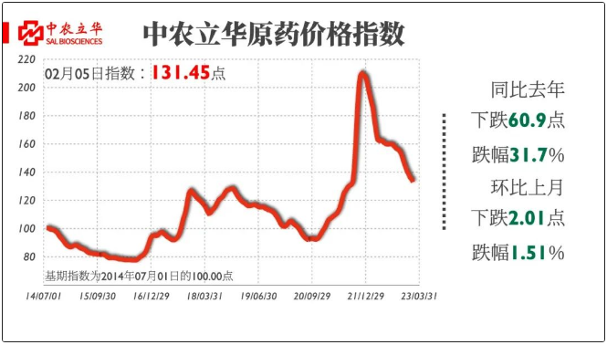 2023年2月5日,中农立华原药价格指数报131.45点,同比去年大跌31.7%,环比上月下跌1.51%,除草剂、杀虫剂、杀菌剂均有所下跌。跟踪的上百个产品中,同比去年,81%产品下跌;环比上月,无上涨品种,20%产品走低。