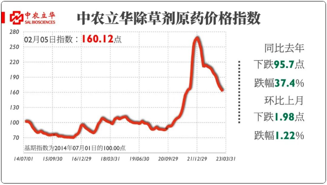 2023年2月5日,中农立华除草剂原药价格指数报160.12点,同比去年大跌37.4%。主要受终端制剂价格的低价影响,倒逼上游降价,敌草快母药、草甘膦原药、草铵膦原药继续走低。