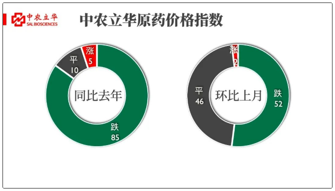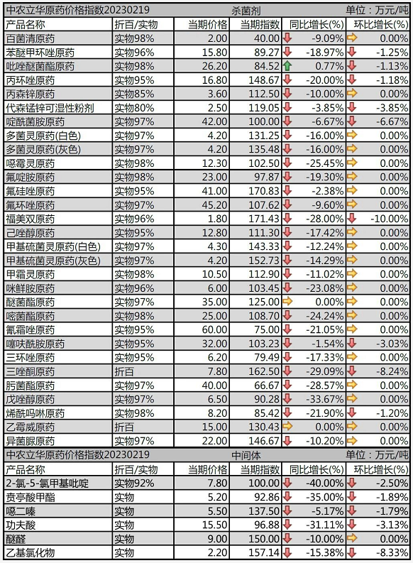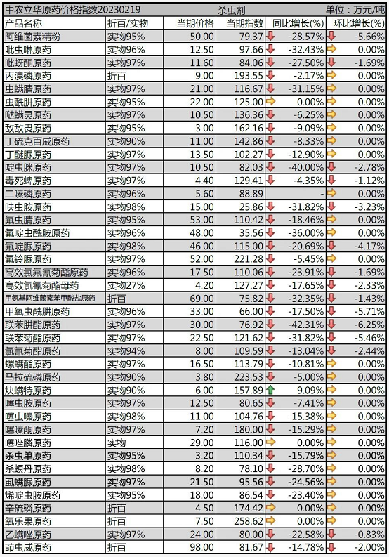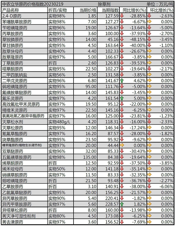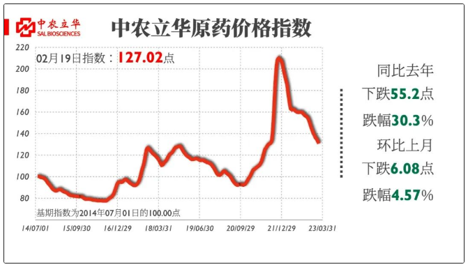 2023年2月19日,中农立华原药价格指数报127.02点,同比去年大跌30.3%,环比上月下跌4.57%,除草剂、杀虫剂、杀菌剂市场行情仍继续走低。跟踪的上百个产品中,同比去年,85%产品下跌;环比上月,上涨品种很少,52%产品走低。