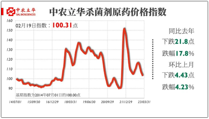 2023年2月19日,中农立华杀菌剂原药价格指数报100.31点,同比去年大跌17.8%,环比上月下跌4.23%。杀菌剂市场需求较为稳定,产品稳中盘整,成本线附近产品下跌空间有限。