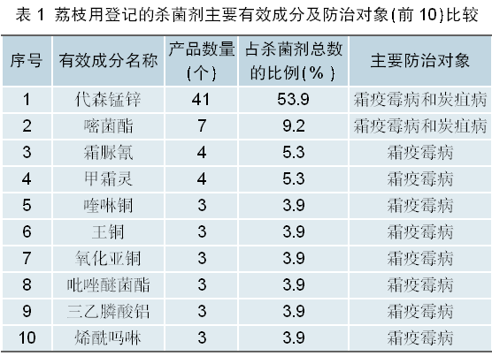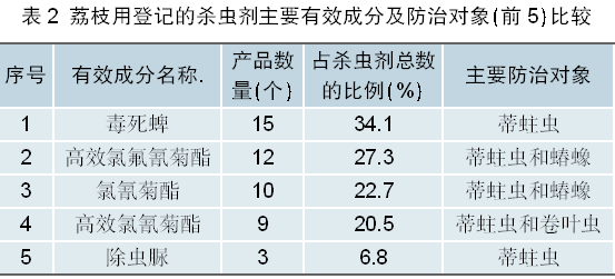 荔枝在东南沿海城市是一种较为重要的经济作物,发生病虫害后,一是严格科学用药,就会出现用药范围窄,选择性有限,成分单一,如霜疫霉病的69个产品中41个产品有效成分为代森锰锌,易出现抗药性。