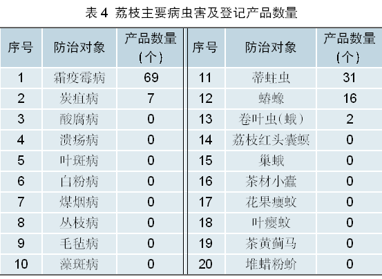 统计荔枝主要病虫害及相应登记产品数量显示荔枝用药极度短缺。10种主要病害只有霜疫霉病和炭疽病有登记用药,10种主要害虫只登记了蒂蛀虫、蝽蟓和卷叶虫(蛾),其余均无登记用药(表4)。