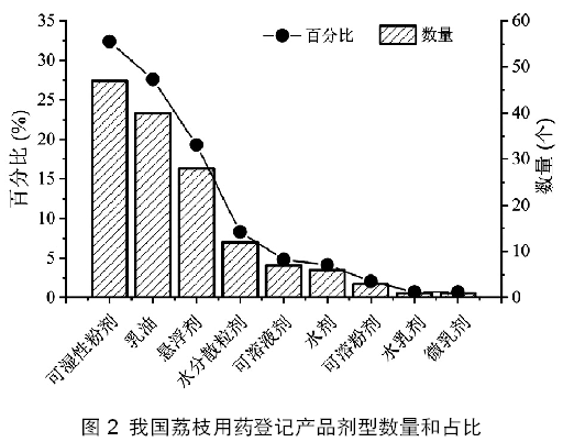 荔枝的登记产品剂型共计9种(图2)。可湿性粉剂占据第1位,47个产品占总数的32.4%,分析其原因主要是2010年之前登记的产品代森锰锌最多,其中33个产品含有代森锰锌,占比高达70.2%。乳油40个,占登记总数的27.6%;悬浮剂28个,占登记总数的19.3%;水分散粒剂12个,占登记总数的8.3%;可溶液剂7个,占登记总数的4.8%;水剂6个,占登记总数的4.1%;可溶粉剂3个,占登记总数的2.1%;水乳剂和微乳剂各1个,分别占登记总数的0.7%。