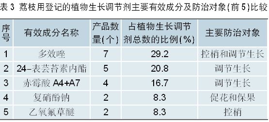 登记的24个植物生长调节剂,涉及有效成分14个。其中多效唑7个(单制剂7个),占植物生长调节剂总数的29.2%,主要控梢和调节生长;24-表芸苔素内酯5个(单制剂1个,混配制剂4个),占植物生长调节剂总数的20.8%,用于调节生长;赤霉酸(A4+A7)4个(混配制剂4个),占植物生长调节剂总数的16.7%,调节生长;复硝酚钠为2个单制剂,占植物生长调节剂总数的8.3%,主要用于促花和保果;乙氧氟草醚为2个单制剂,占植物生长调节剂总数的8.3%,主要用于控梢(表3)。