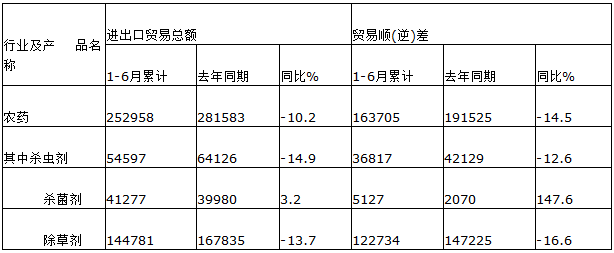 2015年上半年中国共出口农药69.1万吨同比增加3.3%出口金额达到20.8亿美元同比大幅减少11.9%其中杀菌剂出口量和出口金额均保持增长态势增幅分别为9.4%和10.4%;杀虫剂出口量为11.4万吨同比减少7.4%出口金额达到4.6亿美元同比大幅减少14%;除草剂出口量为51.0万吨同比增加4.9%出口金额为13.4亿美元同比大幅减少15.1%。