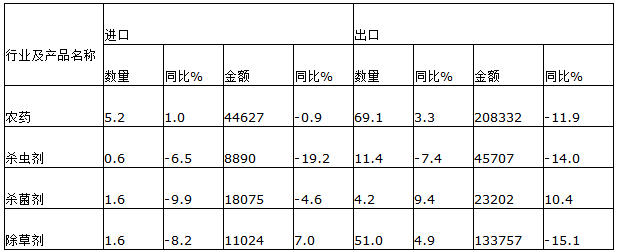 根据海关总署统计2015年上半年中国共进口农药5.2万吨同比增加1.0%进口金额达到4.5亿美元同比减少0.9%。其中杀虫剂进口量为0.6万吨同比减少6.5%进口金额为0.9亿美元同比大幅减少19.2%;杀菌剂进口量为1.6万吨同比大幅减少9.9%进口金额为1.8亿美元同比减少4.6%;除草剂进口量1.6万吨同比减少8.2%进口金额1.1亿美元同比增长7.0%。