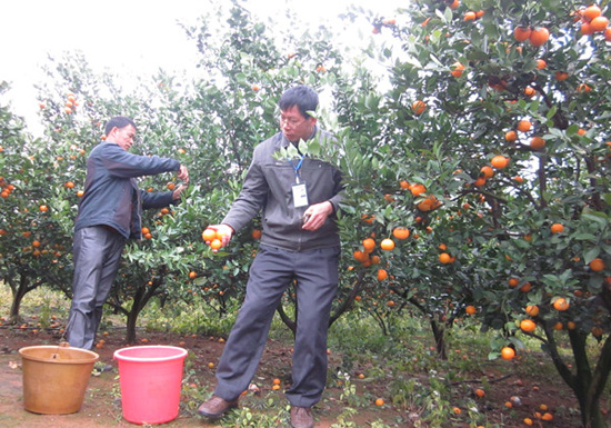 图为工作人员正在钟山县昱成贡柑果园抽取贡柑样份