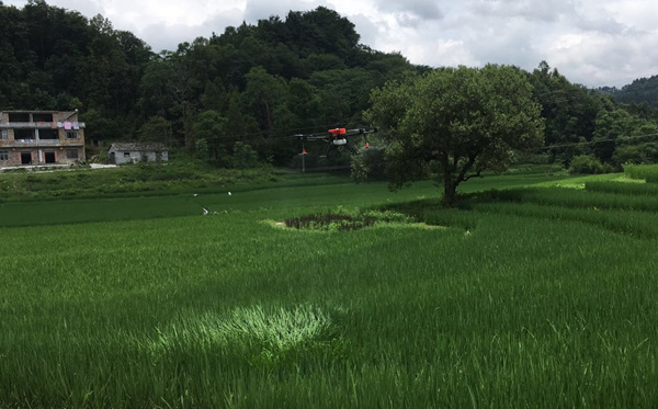 芒场镇蛮坝村打希屯是南丹唯一入选广西首批三个创建 “中国有机示范村(屯)”,为更好地开展创建工作,打希屯与南丹兴农科技有限公司合作,运用现代化飞防技术,开展对水稻病虫害的防治工作。