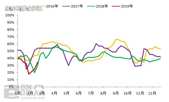 从下游复合肥工厂来看,今年装置在二月份之后开始略有回升,但速度较之2018年相对缓慢,但因18年春节时间比19年晚,所以同比来看,现如今复合肥开工34%,去年同期30%,开工还是有所回升的。