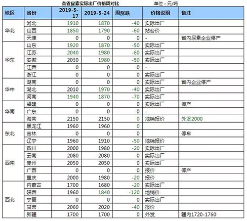 本周国内尿素市场延续不断下滑态势,陕西等局部区域报价周跌幅高达120元,山东、两河地区周跌幅在50-60元,山西周跌幅在80-100元。价格持续下滑的主要原因仍然是国内整体需求疲软所导致,北方夏季肥启动缓慢,南方水稻用肥期已过,农业尿素市场需求疲软,经销商谨慎观望为主。整体市场看空气氛越来越浓厚,尿素厂家对后市信心不足,新单收款承压下,继续降价促销。开工方面,虽有检修厂家,但整体开工仍呈上升态势,供应面继续宽松,需求面跟进严重不足。