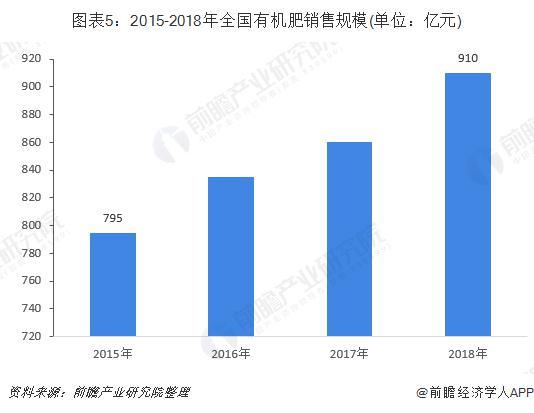 随着国家加大有机肥行业政策支持力度,有机肥替代化肥试点在全国范围大规模的展开,我国有机肥实现了快速发展,我国有机肥料市场规模也呈逐年增长趋势,2015年约为795亿元,至2018年达到910亿元,年均增速达4.8%。