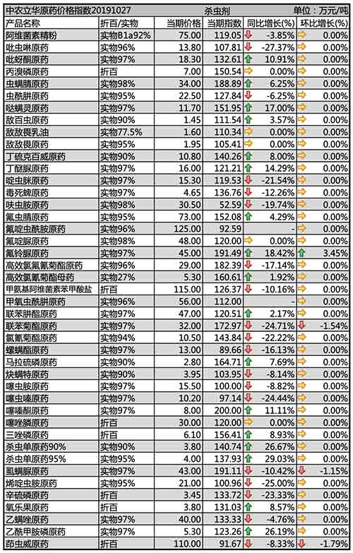下跌:阿维菌素精粉、吡虫啉原药、虫酰肼原药、啶虫脒原药、毒死蜱原药、呋虫胺原药、高效氯氟氰菊酯原药、甲氨基阿维菌素苯甲酸盐、联苯菊酯原药、氯氰菊酯原药、螺螨酯原药、炔螨特原药、噻虫胺原药、噻虫嗪原药、虱螨脲原药、烯啶虫胺原药、辛硫磷原药、乙螨唑原药、茚虫威原药等