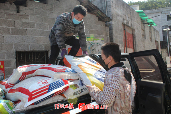 2月18日,都安瑶族自治县下坳镇农业技术推广中心农资配送员正在装载化肥等农用物资。