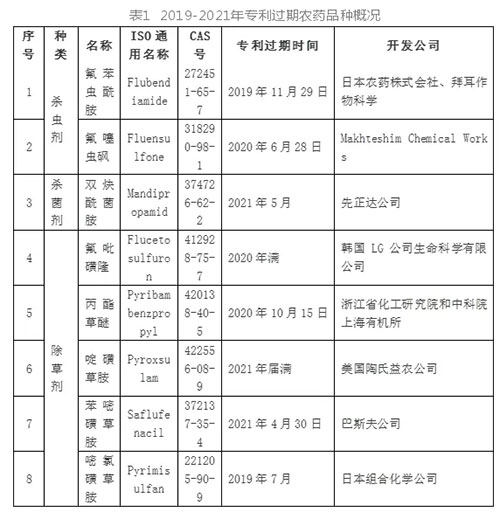 2019—2021年专利过期的农药品种共有8个,包括2个杀虫剂、1个杀菌剂和5个除草剂(表1),主要包括日本农药株式会社、拜耳作物科学开发的氟苯虫酰胺、先正达公司开发的双炔酰菌胺、巴斯夫公司开发的苯嘧磺草胺。本文简要其的结构、作用方式及防治效果进行简要概述,以供企业参考登记……