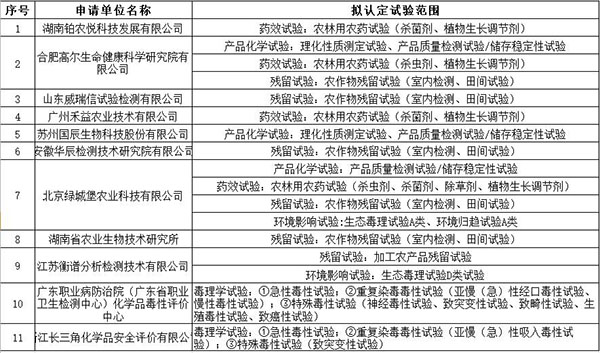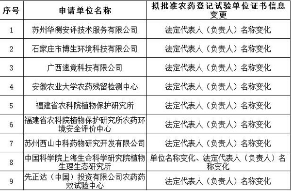 按照《行政许可法》《农药管理条例》有关规定,现将评审通过认定的11个农药登记试验单位相关信息,以及9家农药登记试验单位证书信息变更相关信息予以公示,如对公示内容有异议,请在公示期内以传真或电子邮件形式实名反馈(对未实名反馈的,将不予以回复)。