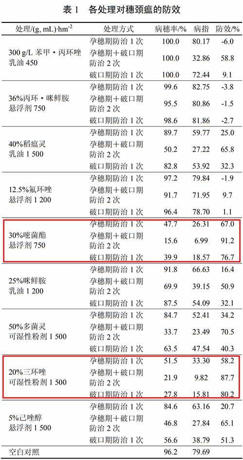 试验结果表明,对于同种药剂,孕穗期+破口期防治 2 次的效果好于破口期防治 1 次,破口期防治 1 次的效果又好于孕穗期防治 1 次。建议在穗颈瘟一般发生年份,可使用 20%三环唑可湿性粉剂于水稻破口期喷雾防治 1 次;在穗颈瘟重发年份,应于水稻孕穗期、破口期和齐穗期连用 3 次,并注意交替轮换用药,延缓抗药性产生。