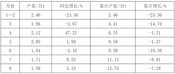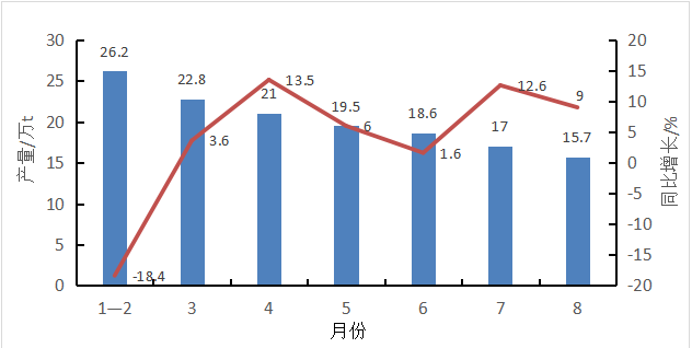 图1 2020年1—8月全国化学农药原药产量及增长情况
